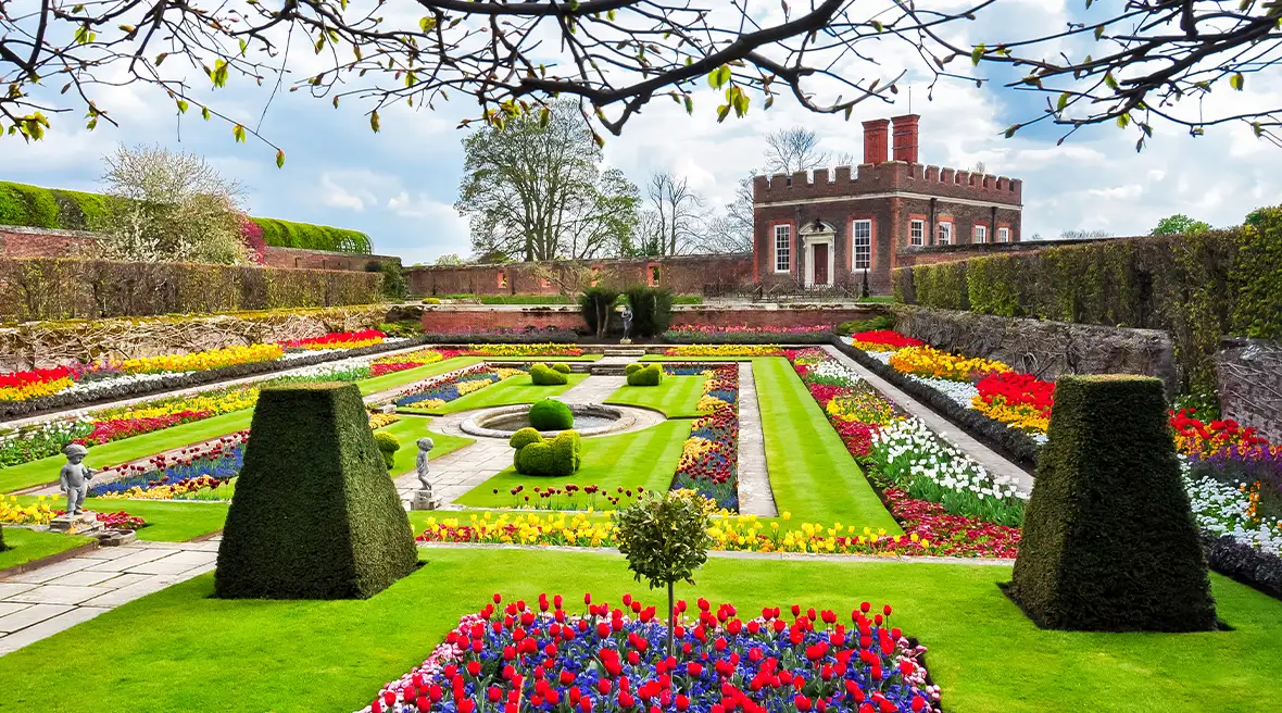 Le Palais est également réputé pour ses jardins manucurés et ses parcs boisées qui s’étendent sur plus de 300 hectares. Vous pourrez notamment découvrir le Jardin de la Fontaine ( « The Great e Garden »), le Jardin de l’Orangerie (« The Lower Orangery Garden ») qui abritait les plantes exotiques de la reine Mary II, le Jardin des Cuisines (« The Kitchen Garden ») ou la plus grande vigne du monde (« The Great Vine »), plantée en 1768 par le célèbre jardinier Capability Brown.