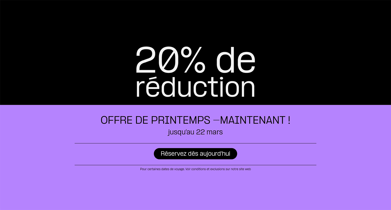 L’offre se termine le 22 mars. Ne manquez pas ces tariffs incroyables pendant notre promotion de 20 % et réservez votre voyage dès aujourd’hui !