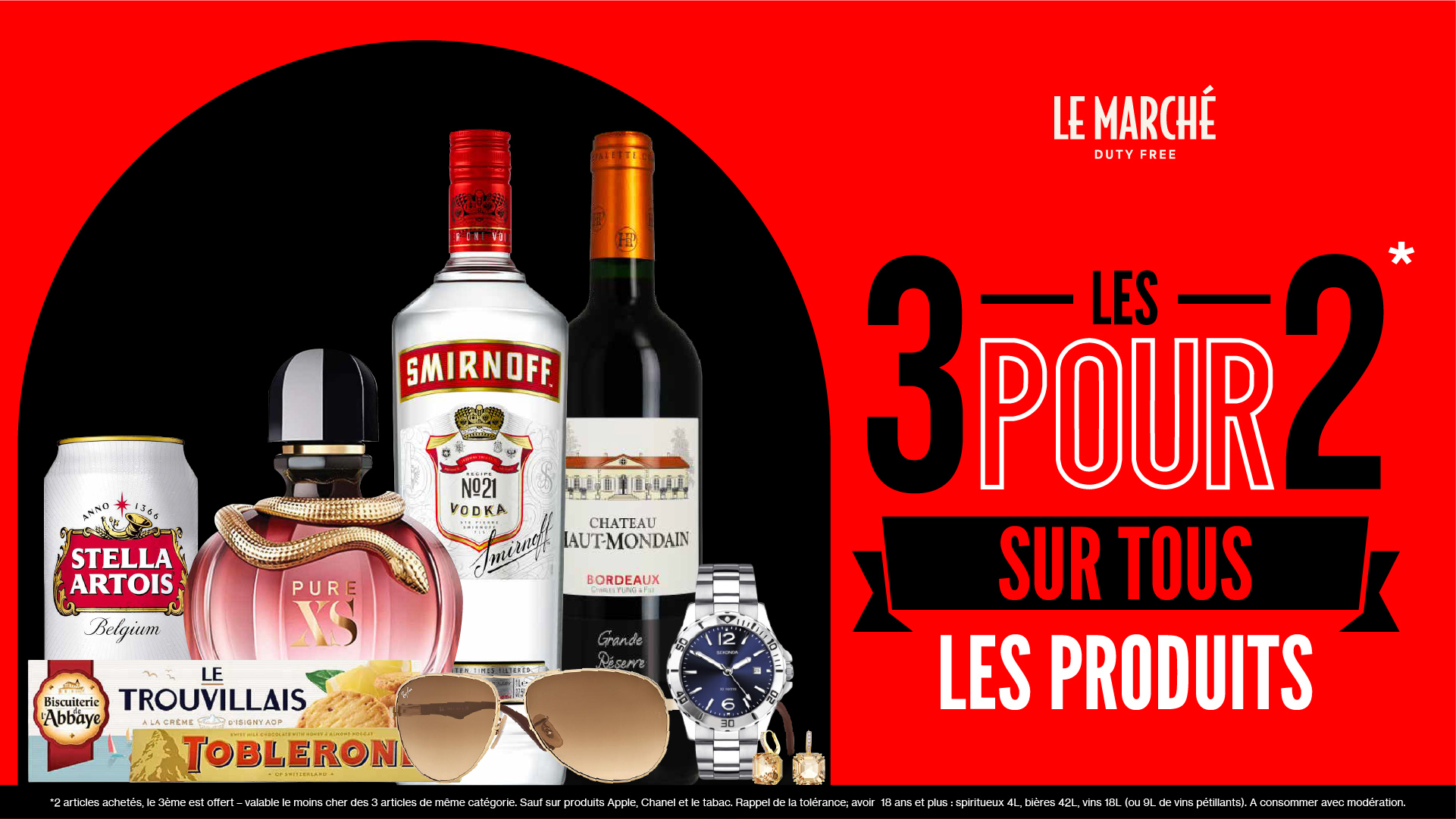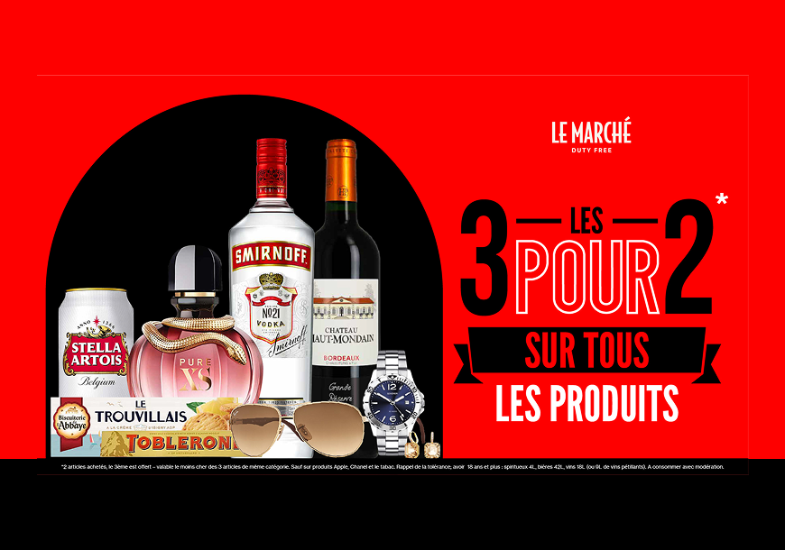 Le Marché Duty Free vous fait profiter d’économies exceptionnelles dans toute sa boutique avec une offre exclusive 3 pour 2 sur l’ensemble du magasin (hors Apple, Chanel et tabac).