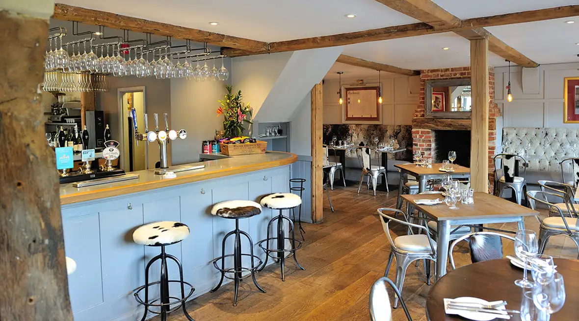 Als je hier binnenloopt kom je terecht in een ruimte met een fris en modern interieur, houten balken aan het plafond en kun je je verwarmen aan de openhaard. De sfeervolle gerestaureerde pub uit de 13e eeuw The Dog at Wingham heeft niet voor niets de ‘National Pub & Bar Award 2018’ gekregen. Verwen jezelf met een heerlijke creatie uit de gin bar of probeer een keuze te maken uit de lekkere bieren en de uitgebreide wijnkaart.