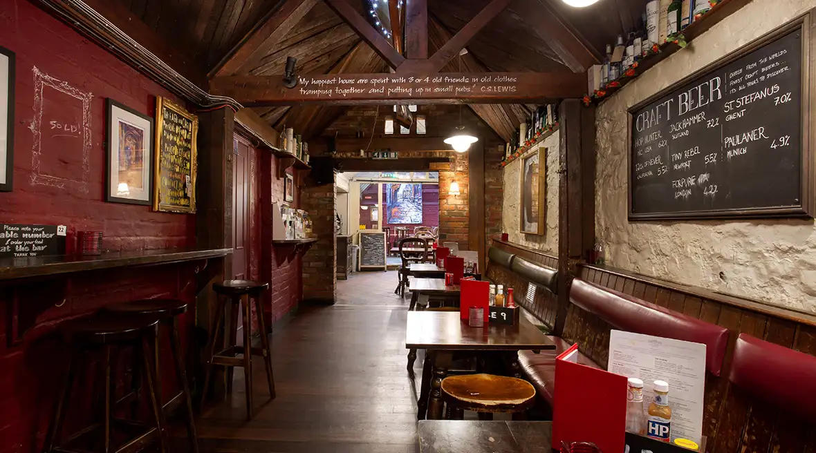Deze authentieke Engelse pub heeft prachtige oude houten balken, en je vindt er tegels die uit de kathedraal van Salisbury zijn gekomen.