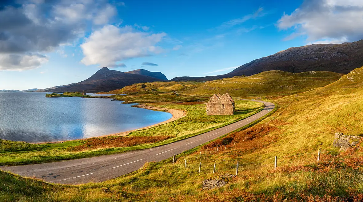 De North and West Highland Route voert je langs de hele noordelijke kustlijn van Schotland, van het prachtige Ullapool tot aan het meest noordelijke punt van Schotland: John O’Groats. Je rijdt langs ruige, wilde kustgebieden, onderbroken door verlaten zandstrandjes. In de rivieren zie je zalmen zwemmen en in zee kun je dolfijnen zien. Als je in de winter komt, kun je hier zelfs het Noorderlicht zien!