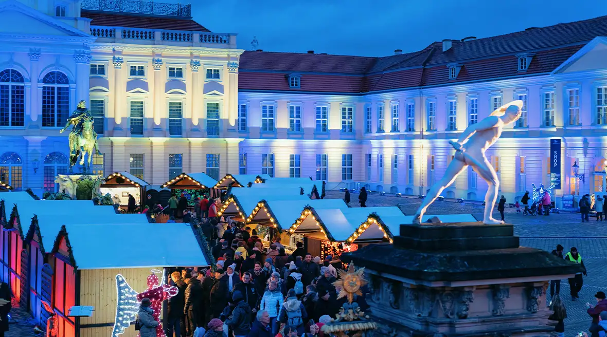 Decorated by colourful lights, Charlottenburg Palace in Berlin transports visitors back to Christmas past, with its famous market.