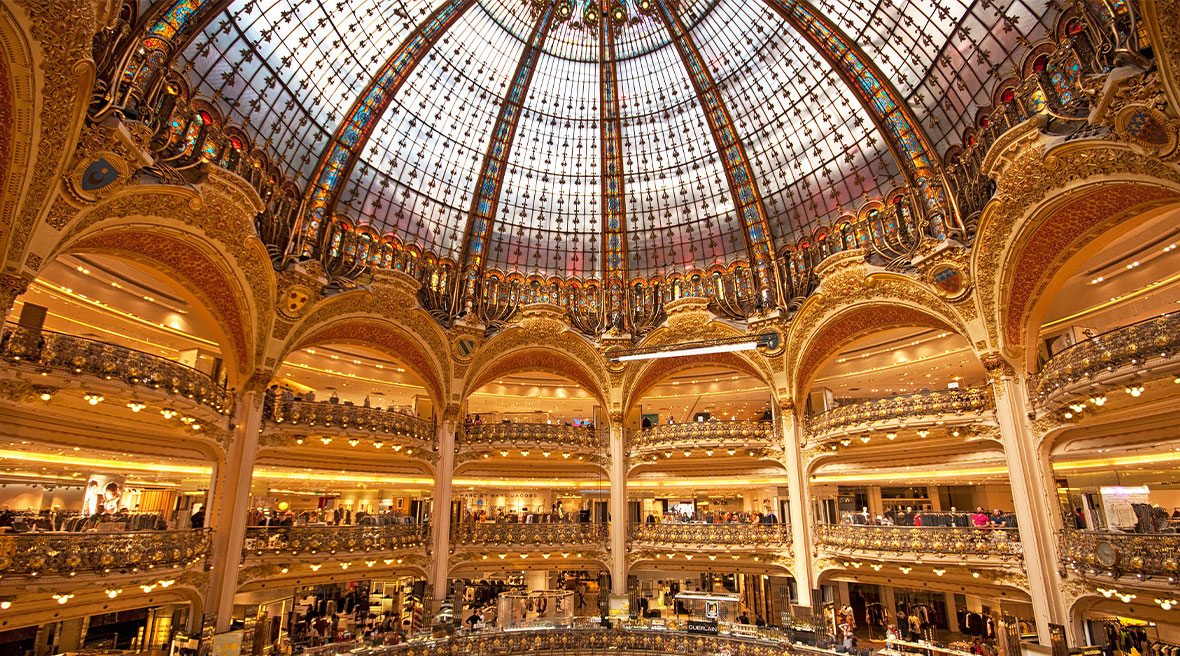 Galeries Lafayette began as a haberdashers in 1893 and today occupies three buildings on Boulevard Haussmann. The main building, Lafayette Coupole, is 10 storeys tall and famous for its Art Nouveau architecture and magnificent glass dome.