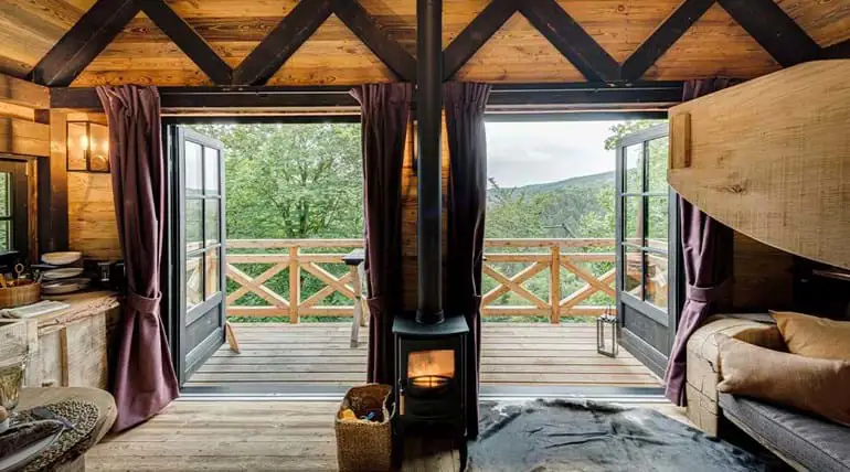 Les Cabanes de Rensiwez has beautiful natural surroundings, with charming cabins in the heart of the forest. You will find cabins perched on a rocky ridge overlooking a beautiful valley, enchanting rolling hills or by the river with magical views. Most of them come with Nordic outdoor bathtubs and some even have wood-heated saunas too!