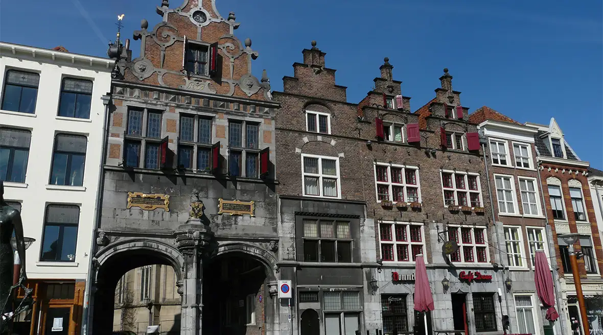 De Grote Markt is the main city square in Nijmegen. Some of it was badly hit by the wartime bombings, so there is a mix of old and more modern buildings in the square. They include the charming Boterwaag (the weighing house) and the Sint-Stevenpoortje, the medieval gatehouse with its gabled archway to the Stevenskerk, the oldest and largest church in Nijmegen. The square hosts a weekly market and is lined with attractive cafés, bars and restaurants.
