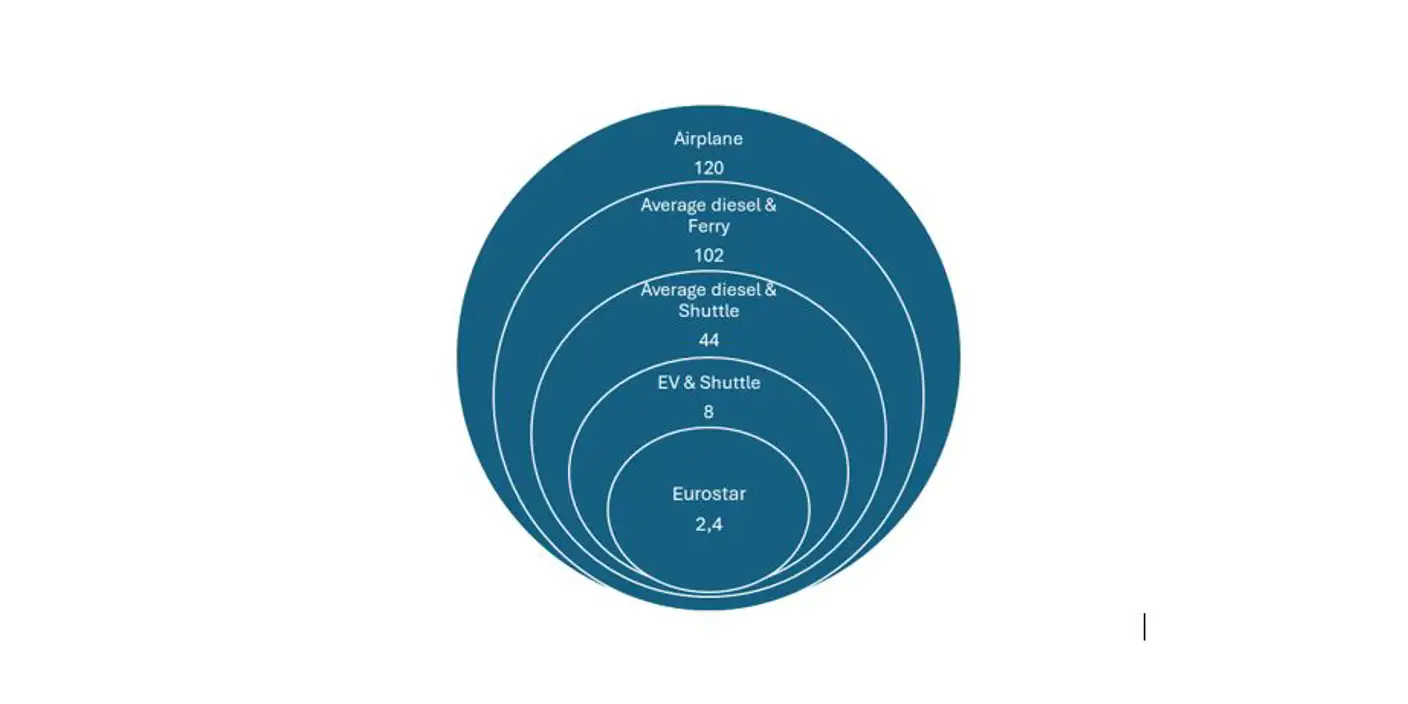 o Eurotunnel Passenger Shuttles: 100% ferry use (a journey by ferry is estimated at 117 kg CO2eq, i.e. 52 times greater emissions than a journey in electric Passenger Shuttles (2 kg CO2eq) according to the 2024 JMJ Conseil study;